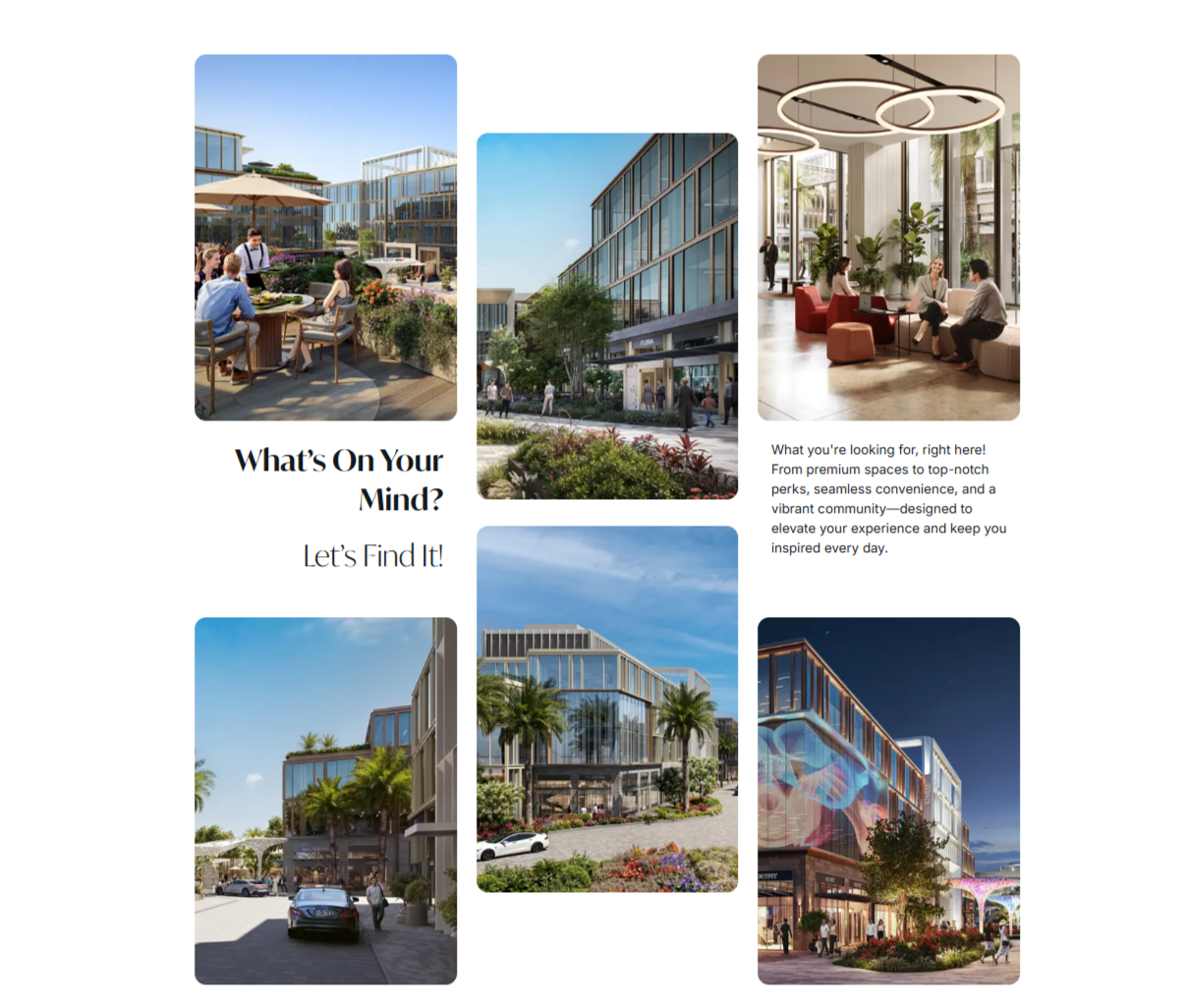 With lush outdoor spaces, a stunning landscape promenade, and premium rooftops overlooking a central plaza, the parks foster a refreshing, engaging environment. Its climate-conscious design and LEED Gold certification target reinforce a commitment to sustainability. Double-height entrance lobbies and state-of-the-art co-working spaces energize the professional experience, while a direct pedestrian link to the Mall of Egypt enhances connectivity.